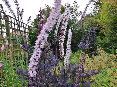 Высота цветущего куста 180 см. Стебли пурпурные, листья пурпурно-фиолетовые, почти черные. Цветки белые, пахнут черемухой, собраны в компактные узкие соцветия около 20 см длиной на разветвленных цветоносах. Цвет листвы сохраняется до глубокой осени. Нарастает медленно.