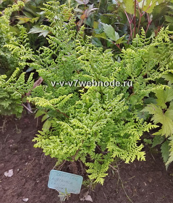 Изящный “хохлатый” папоротник высотой около 60 см. Листья широкие, разрезные, светло-зеленые, с густыми, закручивающимися сегментами по краю. Лист жесткий, но в тоже время смотрится воздушно. Неприхотлив, зимостоек, но медленно разрастается.