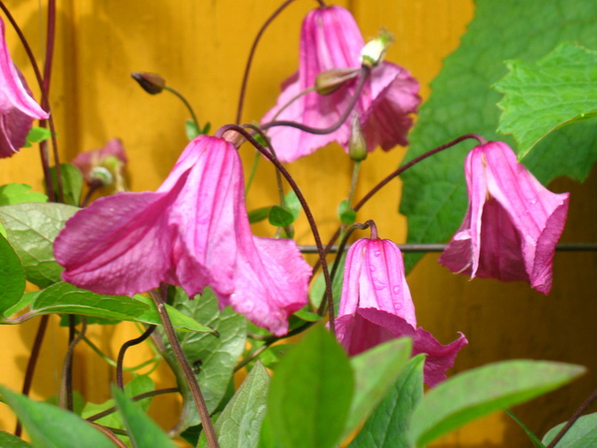 Этот клематис принадлежит к группе интегрифолия. Сорту более 50 лет, но за это время он показал себя только с лучшей стороны. Надежный и очень декоративный. Высота до 2 м. Побеги не цепляются опоры, поэтому требуется подвязка. Цветки диаметром до 10 см, яркие, розово-лиловые пониклые колокольчики, состоящие из 4 широких лепестков, которые слегка перекручены. Пыльники желтоватого цыета. Цветет долго, в течении месяца, а то и более, в июле-августе. Сорт очень зимостоек и неприхотлив. На зиму побеги обрезают, оставляя 5-10 см или 3-4 почки над землей.